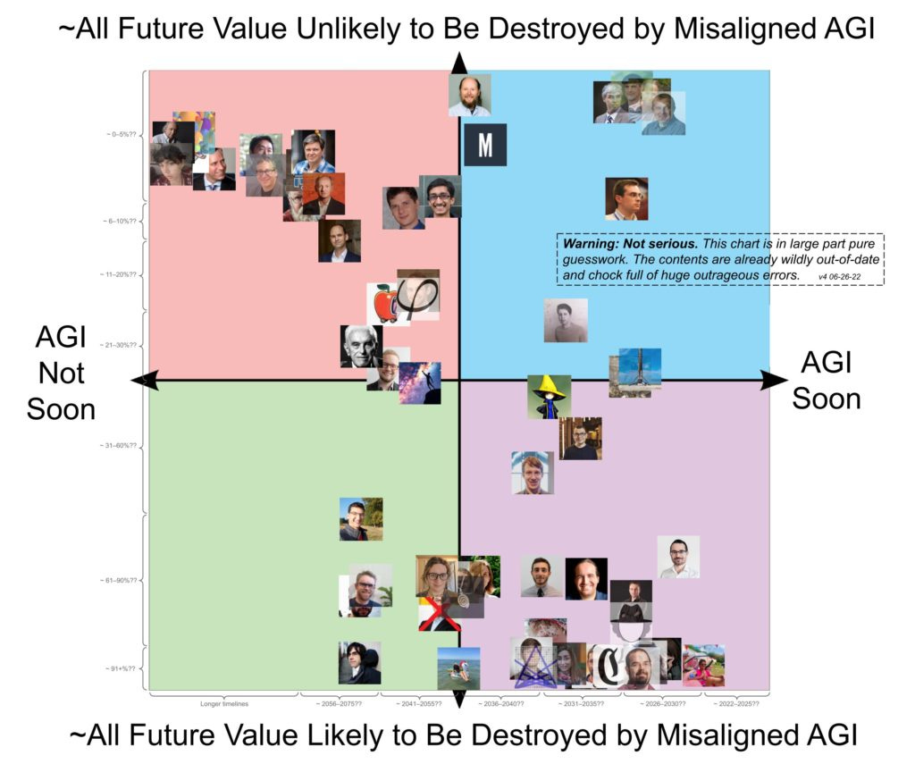 There is also this graph,[note] https://twitter.com/robbensinger/status/1541228487205236736/photo/1. [/note] which claims to be “wildly out-of-date and chock full of huge outrageous errors.” This graph seems to suggest some correlation between two different doom-related questions, and that the distribution is surprisingly bimodal. If we were to take this more seriously than we probably should, we could use it as evidence for a general factor of doom, and that most people’s p(Doom) is close to 0 or 1.[note] There is some discussion of why there is a correlation between these two particular questions here: https://twitter.com/infinirien/status/1537859930564218882. To actually see a general factor of doom, I would want to look at more than two questions. [/note] I do not think that this graph is particularly strong evidence even if it is accurate, but it does gesture in the same direction that I am pointing at.