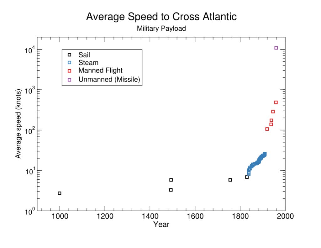 Average speed to cross the Atlantic in wind-powered ships doubled over roughly 300 years, after which crossing speed for steam-powered ships doubled in about 50 years, and crossing speed for aircraft doubled twice in less than 40 years.
